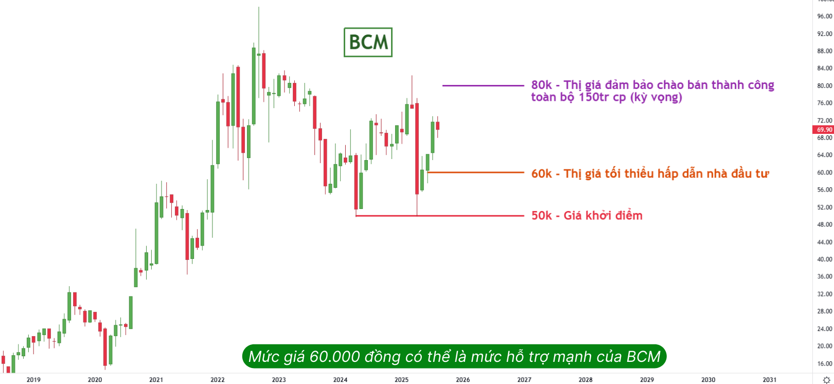 Để đợt chào bán diễn ra thành công thì GMTT cho rằng giá trên sàn cần phải cao hơn giá khởi điểm ít nhất là 20% nhằm dễ thu hút được đối tác mua. Như vậy, có thể mức giá quanh 60k/cổ phiếu đối với BCM có thể là một mức hỗ trợ mạnh. Và GMTT cũng kỳ vọng rằng nếu tại thời điểm đấu giá, thị giá của BCM đạt từ 80k trở lên thì khả năng rất cao BCM sẽ chào bán thành công 150 triệu cổ phiếu trong đợt đầu tiên này.