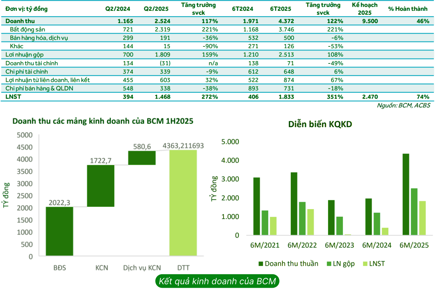 BCM ghi nhận mức tăng trưởng mạnh trong Q2/2025 với doanh thu tăng 117% svck và LNST đạt 1.468 tỷ đồng (+272% svck). Kết quả 6T2025 cũng rất khả quan với doanh thu tăng 122% svck và LNST đạt 1.833 tỷ đồng (+351% svck), hoàn thành lần lượt 46% và 74% kế hoạch năm. Tăng trưởng trong kỳ chủ yếu đến từ:
