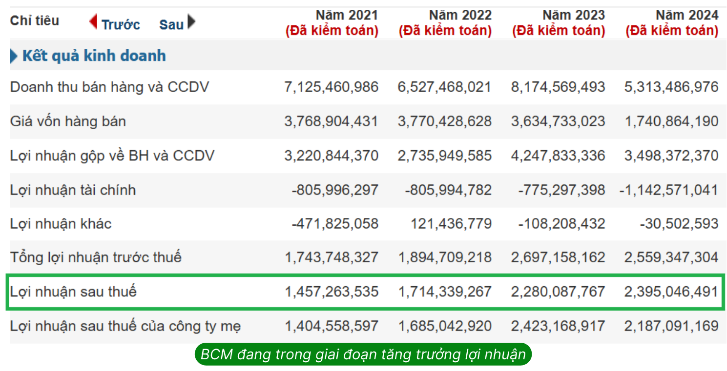 Với kết quả khả quan trong nửa đầu năm, GMTT kỳ vọng lợi nhuận sau thuế cả năm 2025 sẽ vượt kế hoạch năm và đạt tối thiểu 2900 tỷ đồng (+ tối thiểu 20% sv 2024). Có thể thấy trong 4 năm qua BCM liên tục có sự tăng trưởng LN đầy tích cực và năm 2025 hứa hẹn là 1 năm tăng trưởng LN 2 con số của BCM.