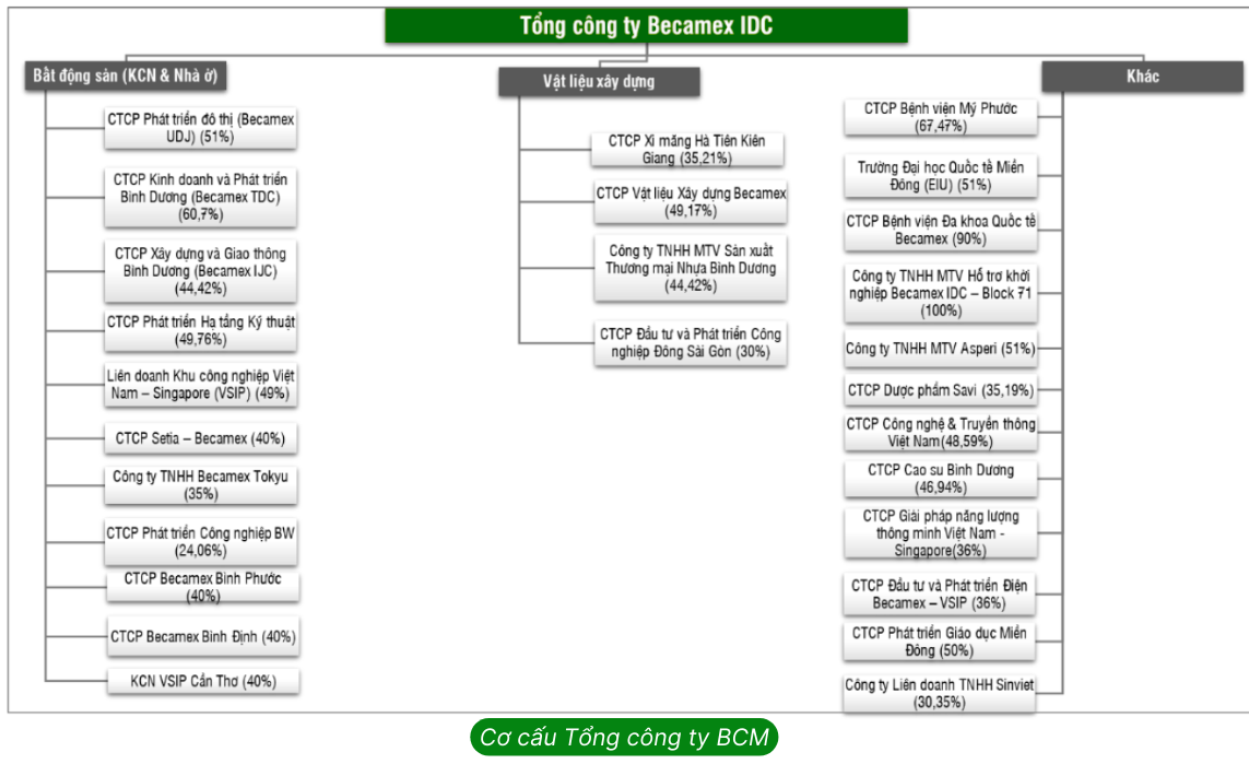 BCM có 23 công ty con và công ty liên kết hoạt động trong nhiều lĩnh vực. Đáng kể nhất trong hệ sinh thái BCM chính là liên doanh VSIP (nơi BCM góp 49% vốn) hiện đang sở hữu quỹ đất KCN lớn nhất cả nước. Bên cạnh các KCN, BCM đang phát triển dự án Thành phố mới Bình Dương với tổng diện tích 1000ha và chi phí đầu tư ước tính khoảng 150 nghìn tỷ đồng. BCM hợp tác với các doanh nghiệp bất động sản quốc tế như Tokyu Land, Capitaland, Gamuda Land …để phát triển các dự án phụ khác nhau trong đại dự án này.