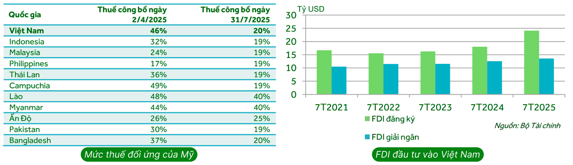 Sau đàm phán, Mỹ đã điều chỉnh giảm thuế đối ứng với Việt Nam từ 46% xuống 20%,tương đương với mức thuế của hầu hết các nước trong khu vực ASEAN và thấp hơn Trung Quốc, Ấn Độ, Lào và Myanmar. Mối lo ngại chính hiện nay là mức thuế 40% đối với hàng trung chuyển qua Việt Nam trong khi chính phủ Mỹ vẫn chưa giải thích rõ cách tính ‘quy tắc xuất xứ’. Biến động thuế quan ảnh hưởng đến khả năng thu hút FDI của Việt Nam và hoạt động cho thuê khu công nghiệp do một số khách thuê tiềm năng đánh giá lại lợi thế chi phí của Việt Nam so với các nước lân cận và trì hoãn quyết định thuê.