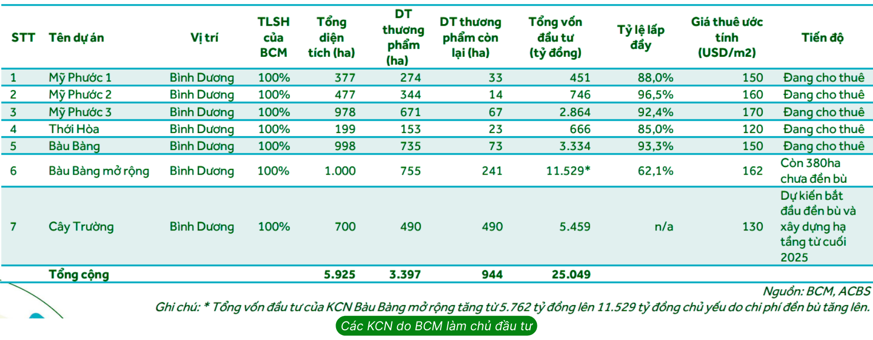 Hiện tại, BCM đang sở hữu và vận hành 7 khu CN.