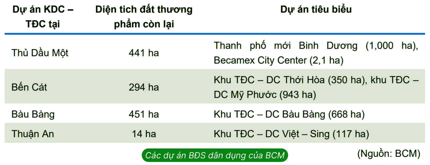 + Quy mô quỹ đất lớn và nằm trong vùng trọng điểm sáp nhập. Các dự án đô thị của BCM chủ yếu nằm tại TP. Thủ Dầu Một, Dĩ An (đặc biệt là dự án trọng điểm Thành phố Mới Bình Dương với tổng quy mô 1.000 ha). Sau sáp nhập, những khu vực này được định vị lại như trung tâm mở rộng của TP.HCM, giúp thu hút nhu cầu nhà ở lớn và gia tăng giá trị bất động sản. GMTT kỳ vọng rằng sẽ có sự chuyển dịch lớn của dòng vốn đầu tư BĐS từ khu vực nội đô sang các khu vực có múc giá bán hợp lý và tỷ suất sinh lời tốt hơn.