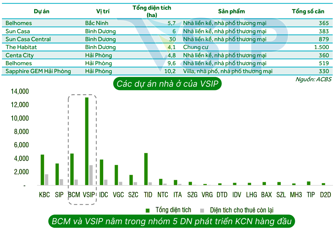 Về KCN, VSIP là đơn vị dẫn đầu thị trường Việt Nam với 17 KCN được phê duyệt với tổng diện tích gần 7.900 ha và thu hút lũy kế khoảng 880 nhà đầu tư từ 30 quốc gia với tổng vốn đăng ký đầu tư khoảng 18,7 tỷ USD. VSIP Nghệ An 3 với tổng diện tích 181ha là KCN mới nhất được phê duyệt vào giữa tháng 3/2025. Cũng trong tháng 3, VSIP Quảng Ngãi 2 đã khởi công xây dựng và VSIP Thái Bình khởi công cuối tháng 3/2025.