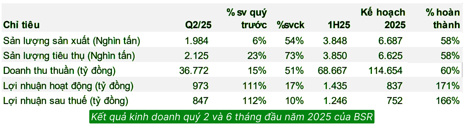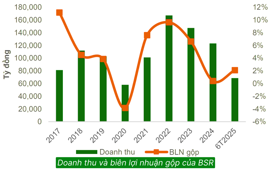 Doanh thu và lợi nhuận năm 2024 của BSR suy giảm chủ yếu do ảnh hưởng tiêu cực từ đợt bảo dưỡng lớn kéo dài 48 ngày của nhà máy. Doanh thu năm 2025 đang hồi phục từ mức nền thấp do nhà máy hoạt động bình thường trở lại.