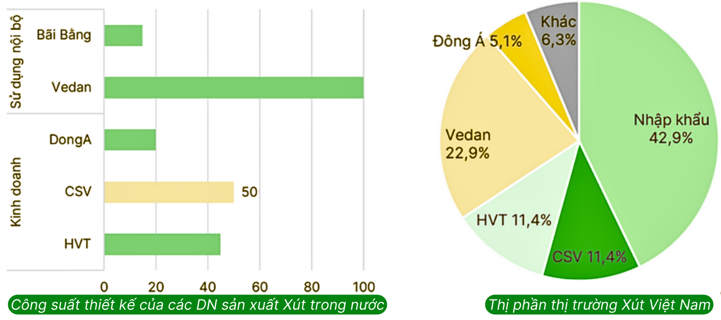 ➢ Công suất sản xuất xút trong nước hiện nay đạt khoảng 230.000 tấn/năm, với 5 doanh nghiệp chủ lực: CTCP Hóa chất Việt Trì (HVT), CTCP Hóa chất cơ bản miền Nam (CSV), CTCP hữu hạn Vedan Việt Nam, Nhà máy giấy Bãi Bằng, CTCP Đông Á. Tuy nhiên, lượng Xút sản xuất trong nước mới chỉ đáp ứng được 55% tổng nhu cầu nội địa. Do đó, hàng năm Việt Nam phải nhập khẩu hơn 100.000 tấn xút (chủ yếu từ Trung Quốc) để bù đắp lượng thiếu hụt.