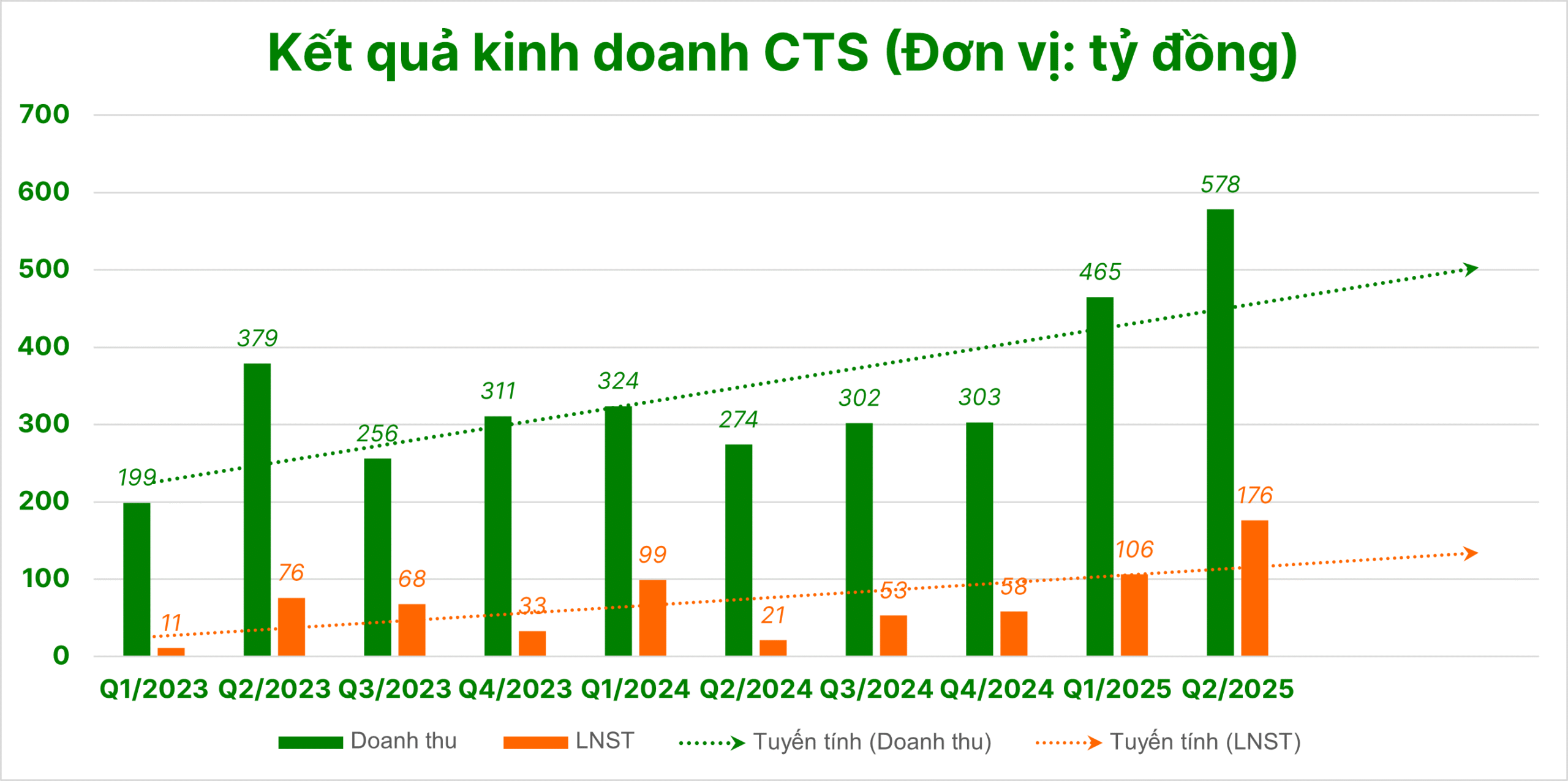 CTS đã công bố KQKD Q2-2025 khá ấn tượng với doanh thu thuần đạt 578 tỷ đồng, tăng 111% yoy và cũng là mức doanh thu cao nhất lịch sử công ty trong 1 quý. LN sau thuế ghi nhận 175.7 tỷ đồng, gấp hơn 8 lần so với cùng kỳ.