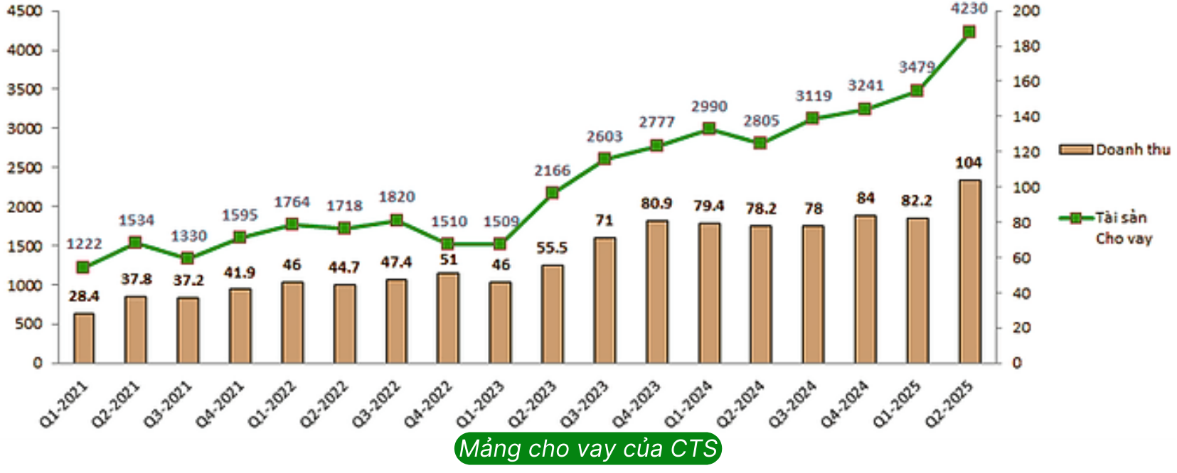 ➢ Mảng cho vay của CTS đã có sự bứt phá mạnh về doanh thu trong quý 2, với 104 tỷ đồng, sau nhiều quý đi ngang dù cho tài sản cho vay vẫn gia tăng trong các quý gần đây. Với việc tài sản cho vay tăng mạnh trong Q3-2025 sau khi tăng vốn sẽ là động lực lớn giúp cho doanh thu mảng cho vay còn có thể tăng thêm nữa trong các quý tới. GMTT kỳ vọng CTS có thể đạt 120-150 tỷ đồng doanh thu trong Q3-2025 từ mảng này.