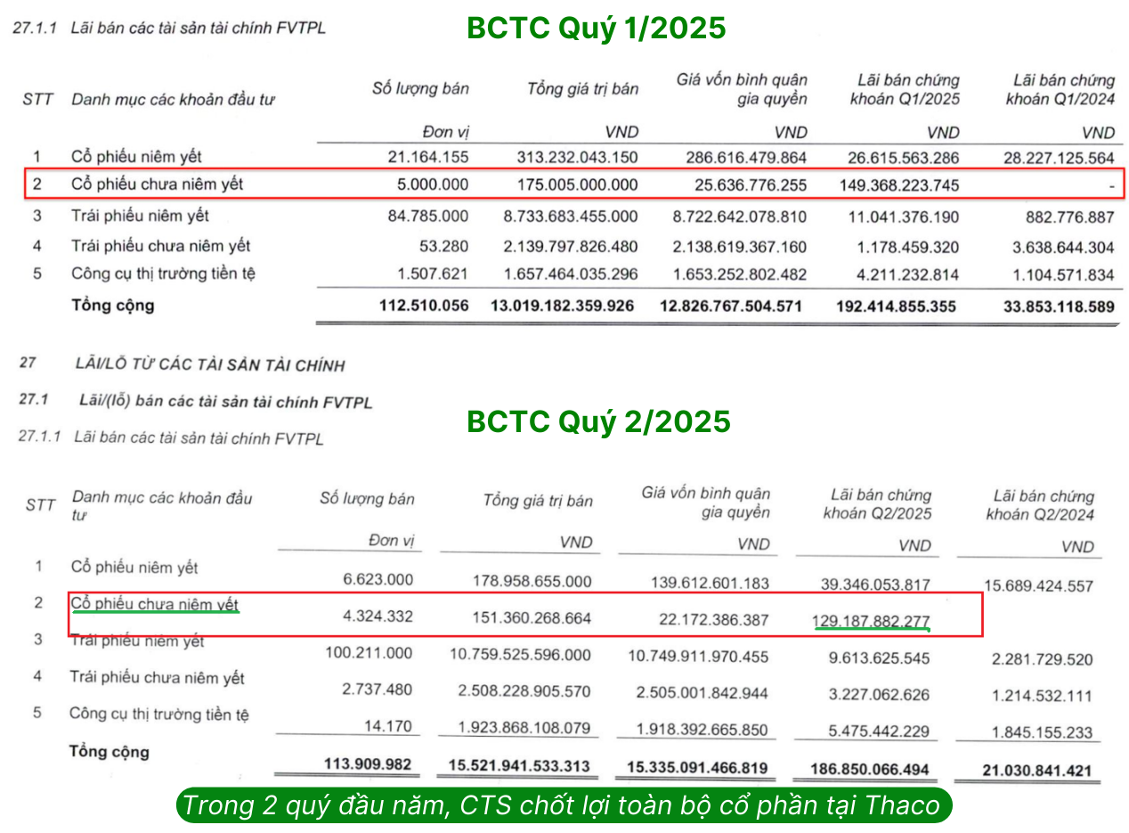 ➢ Trong 2 quý đầu năm, CTS đã bán toàn bộ cổ phần tại CTCP ô tô Trường Hải (Thaco). Với giá vốn thấp, CTS mang về khoản lớn từ việc bán cổ phiếu Trường Hải trong 2 quý này. Nhưng quý 3 thì sẽ không còn những khoản LN lớn như này nữa.