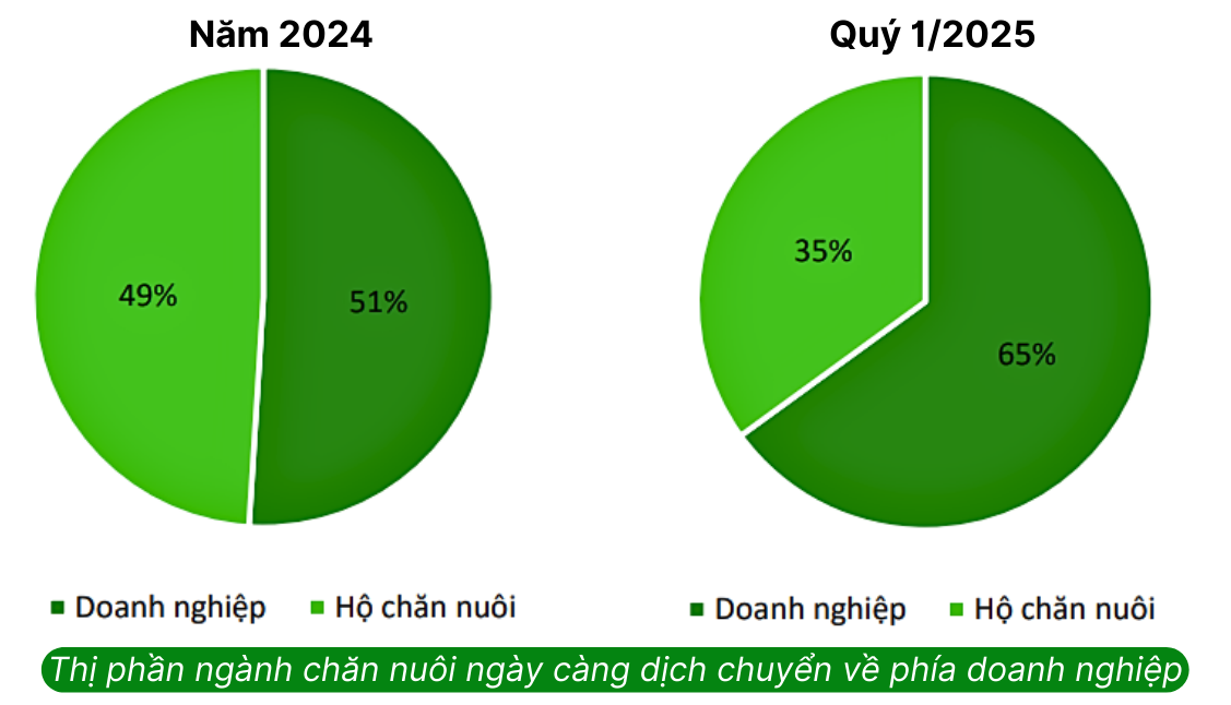Cho đến thời điểm quý 1/2025, thị phần chăn nuôi của doanh nghiệp chiếm 65%, tăng 14% so với thời điểm cuối năm 2024. Dự báo, cơ cấu chăn nuôi của hộ nông dân sẽ tiếp tục thu hẹp về mức 25% cho đến năm 2030, với các nguyên nhân chính như: