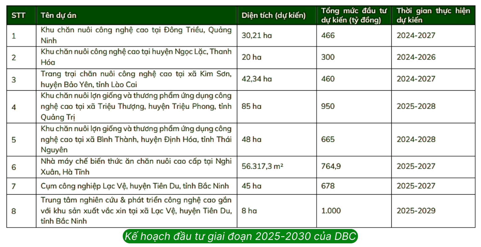 Ngày 29/3/2025, DBC khánh thành nhà máy Dacovet và công bố thương mại hóa vacxin dịch tả lợn châu Phi. DBC dự kiến bán vacxin của mình với mức giá khoảng 59-60.000 VND/liều. Ước tính với công suất ban đầu đạt 16% công suất thiết kế (tức 32/200 triệu liều/năm) thì mảng vacxin có thể đem về thêm 94 tỷ đồng LNTT cho DBC trong năm 2025.