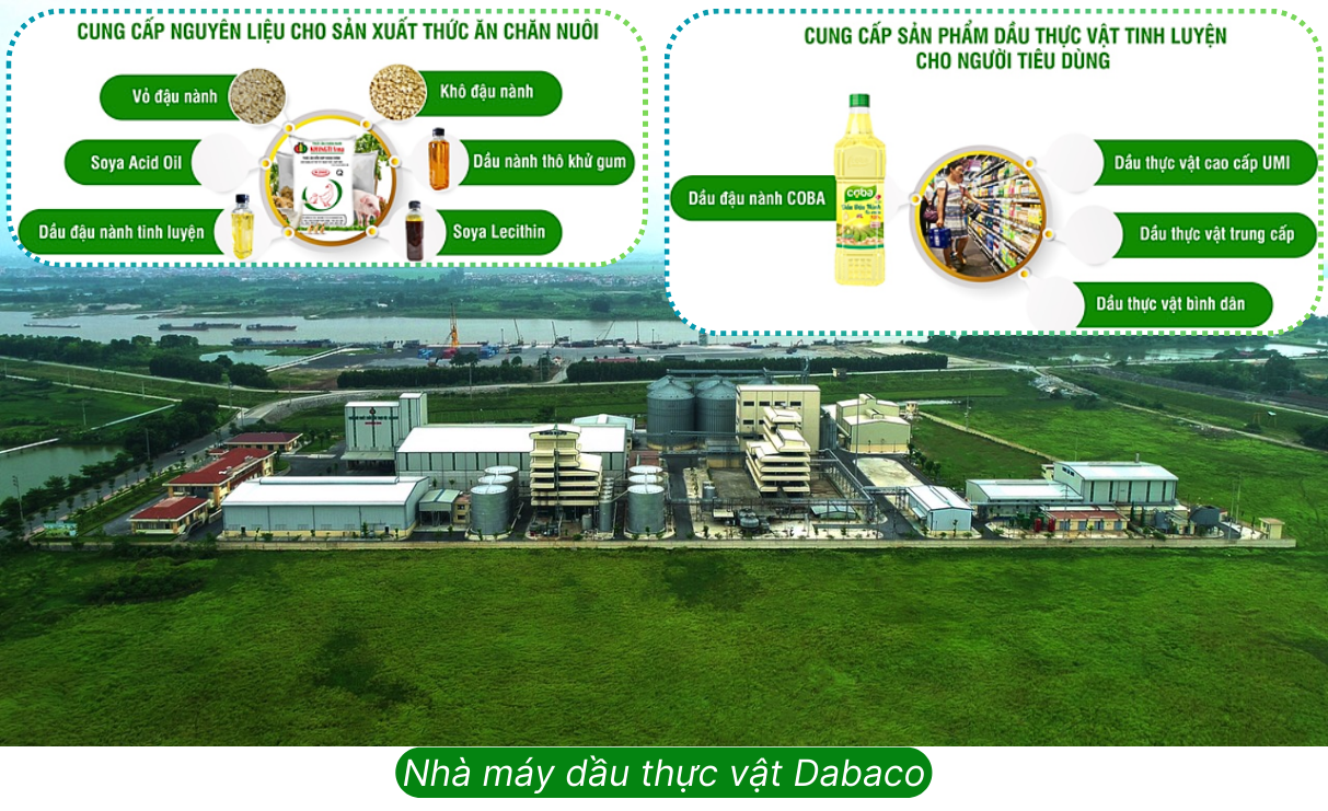 Nhà máy ép dầu thực vật giai đoạn 2 là mắt xích quan trọng trong mô hình 3F của Dabaco, kết nối từ sản xuất thức ăn chăn nuôi (Feed), chăn nuôi (Farm) đến chế biến thực phẩm (Food). Các sản phẩm như khô đậu nành, dầu đậu nành thô, vỏ đậu nành và lecithin sẽ được sử dụng làm nguyên liệu cho sản xuất thức ăn chăn nuôi và dầu ăn cao cấp cho thị trường.