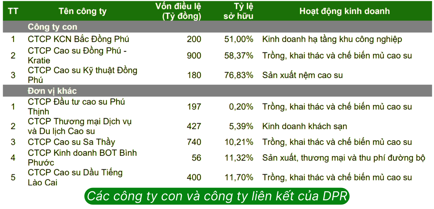 DPR có 03 công ty con và 05 công ty liên kết chủ yếu có các hoạt động kinh doanh liên quan đến cao su, các sản phẩm từ cao su và khu công nghiệp.