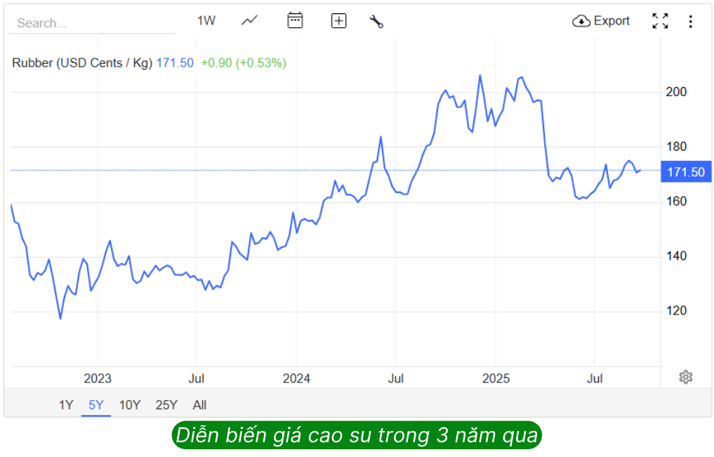 Giá cao su hạ nhiệt trong Q2/2025 nhưng vẫn cao hơn so với 2024 và kỳ vọng duy trì ổn định trong nửa cuối năm. Giá bán mủ cao su trung bình năm 2025 dự kiến đạt ~46 triệu đồng/tấn (tăng 5% YoY) nhờ mức nền cao của 6 tháng đầu năm, đạt ~53 triệu đồng/tấn trước lo ngại về thiếu hụt nguồn cung.