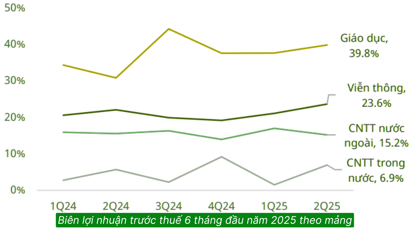 Lợi nhuận trước thuế (LNTT) tăng 14% svck, đạt 3,1 nghìn tỷ, trong đó Viễn thông và Giáo dục & khác gia tăng đóng góp, lần lượt đạt 35,9% và 18,9%. LNTT lũy kế 6T2025 hoàn thành 46,3% kế hoạch năm.