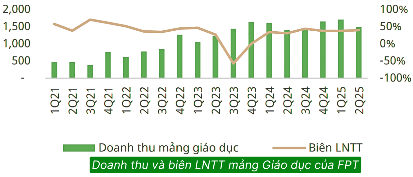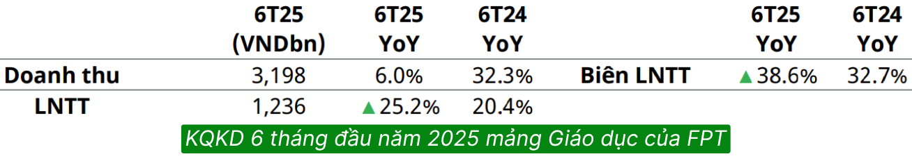 Doanh thu đạt 1,5 nghìn tỷ trong Q2/2025, tăng 5,9% svck. Dù tăng trưởng doanh thu chậm lại, biên LNTT đạt 40%, cải thiện 9 điểm %, nhờ cải thiện tỷ lệ lấp đầy và tăng tỷ trọng đào tạo đại học trong cơ cấu. LNTT mảng giáo dục đạt 600 tỷ, tăng 37% svck.