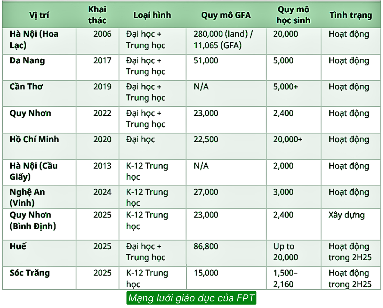 FPT tiếp tục đẩy mạnh đầu tư mở rộng nhanh mạng lưới các trường K-12 tích hợp tại nhiều tỉnh thành, cộng với triển khai thêm các chương trình đào tạo mới về ngành bán dẫn, AI, ô tô. Đây sẽ là bàn đạp thúc đẩy tăng trưởng học viên mới theo học các chương trình của FPT. Doanh thu/học viên dự kiến duy trì ở mức ổn định trong các giai đoạn đầu.