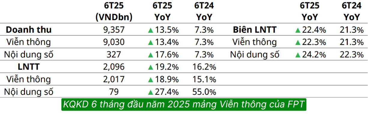 Doanh thu đạt 4.800 tỷ trong Q2/2025, tăng 12,8% svck, nhờ tăng trưởng từ dịch vụ Băng thông rộng. Biên lợi nhuận cao của dịch vụ băng thông rộng giúp biên LNTT Viễn thông cải thiện, đưa lợi nhuận trước thuế đạt 1,1 nghìn tỷ, tăng 21,1% svck.