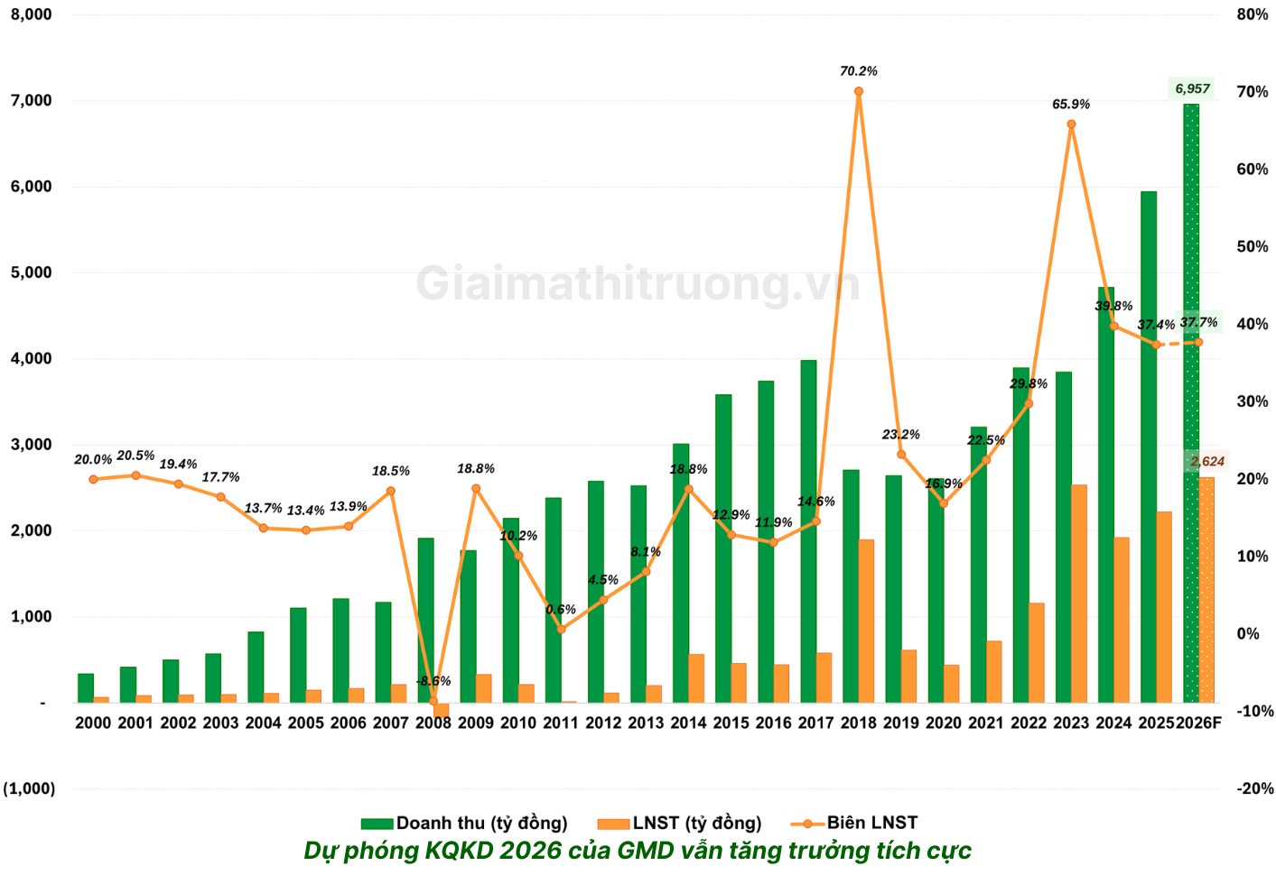 GMTT dự phóng doanh thu và lợi nhuận sau thuế năm 2026 sẽ tiếp tục tăng trưởng, đạt lần lượt 6.957 tỷ đồng (+17% YoY) và 2,624 tỷ đồng (+18% YoY) nhờ sản lượng khả quan và việc triển khai phí dịch vụ mới.