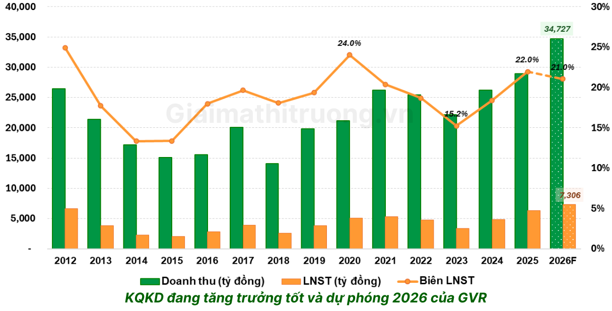 GVR bước vào năm 2026 với nền tảng kinh doanh mạnh nhất lịch sử. Cả năm 2025, tập đoàn ghi nhận doanh thu thuần trên 28.900 tỷ đồng và lợi nhuận trước thuế hơn 7.600 tỷ đồng, tăng lần lượt 10% và 36% so với năm trước. Đặc biệt, tập đoàn vượt 31% kế hoạch lợi nhuận đề ra cho cả năm – một thông lệ quen thuộc của GVR: đặt kế hoạch bảo thủ rồi vượt xa trong thực tế.