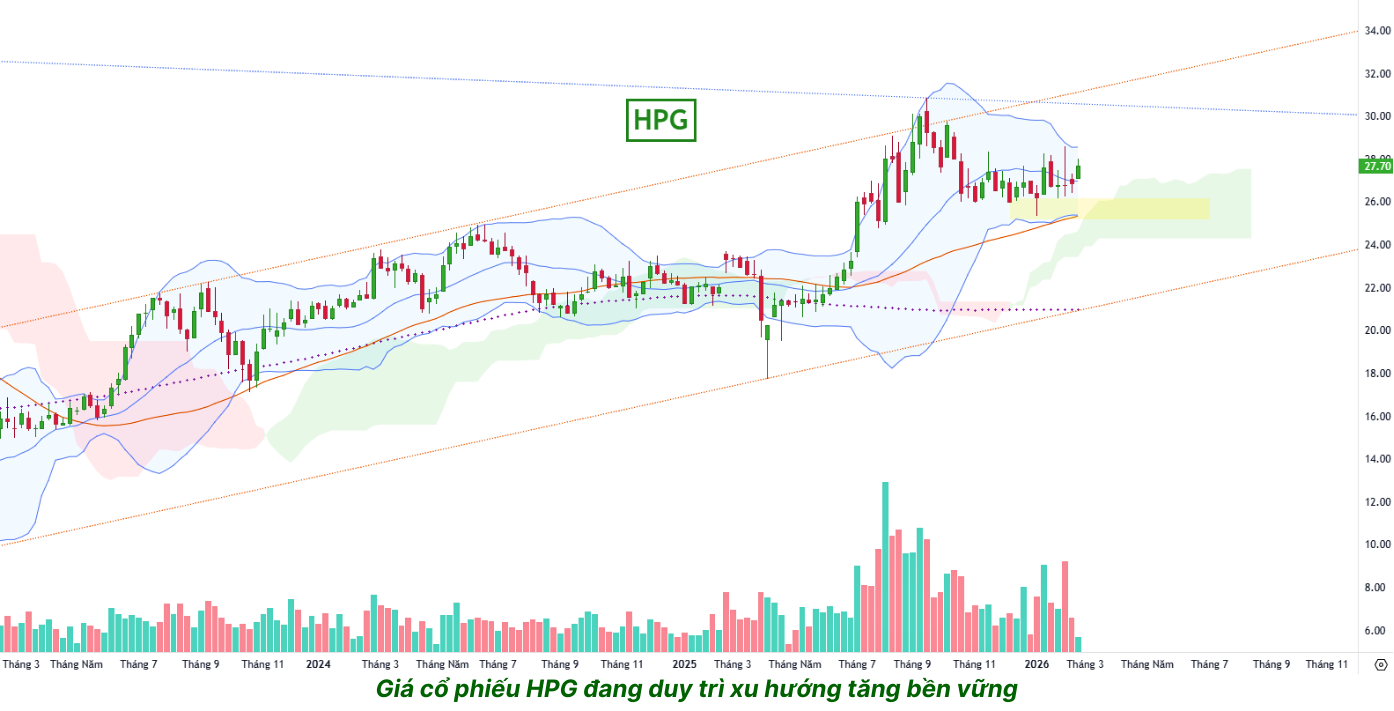 Hiện tại, giá cổ phiếu HPG ngày 23/02/2026 là 27.400 đồng. Với EPS năm 2025 đạt 2.021 đồng/cp, P/E hiện tại vào khoảng 13,6 lần – mức khá thấp so với câu chuyện tăng trưởng mà doanh nghiệp này đang kể.
