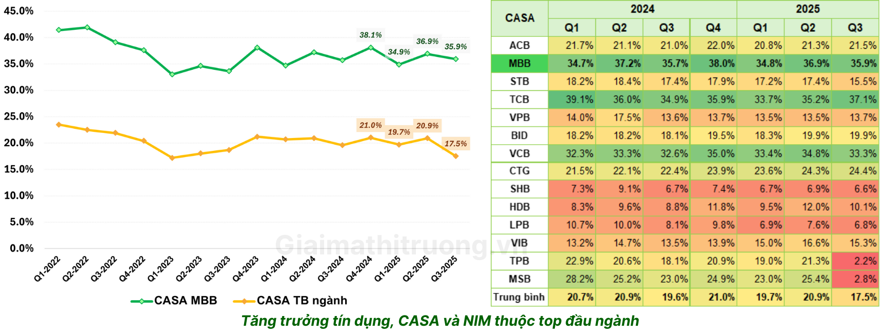 Cuộc đua CASA hiện nghiêng về những ngân hàng làm tốt chuyển đổi số, và MBB luôn được nhắc đầu tiên hoặc thứ hai trong nhóm này. Tỷ lệ CASA đến cuối quý 3/2025 đạt khoảng 35,9%, đứng thứ hai toàn hệ thống.