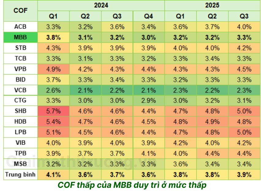 MBB nằm trong nhóm ngân hàng có chi phí vốn thấp nhất hệ thống, đồng thời tỷ lệ chi phí/thu nhập (CIR) quý 3/2025 chỉ khoảng 29,1% – thuộc nhóm thấp nhất ngành. Ở góc độ phân tích, những chỉ số này cho thấy ngân hàng đang vận hành tương đối tinh gọn, khai thác tốt đòn bẩy quy mô mà không đánh đổi quá nhiều về chi phí.