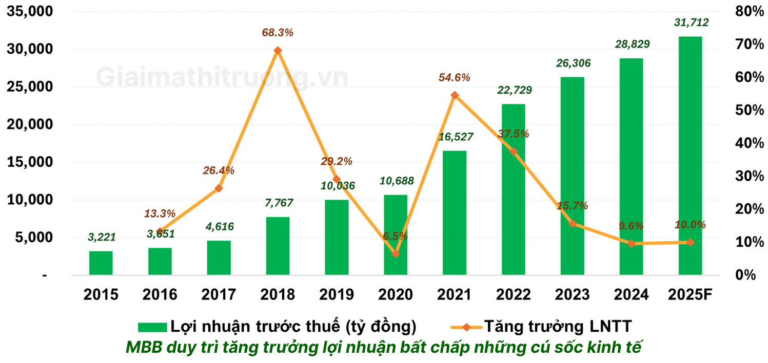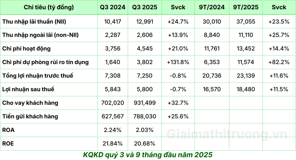Tổng thu nhập hoạt động (TOI) quý 3/2025 của MBB vẫn tăng 22,8% so với cùng kỳ, dù giảm so với quý trước. Tuy nhiên, lợi nhuận trước thuế (LNTT) quý này lại giảm cả so với quý trước lẫn so với cùng kỳ. Lũy kế 9 tháng 2025, MBB ghi nhận 23.139 tỷ đồng LNTT (+12% svck), hoàn thành khoảng 73% kế hoạch lợi nhuận năm.