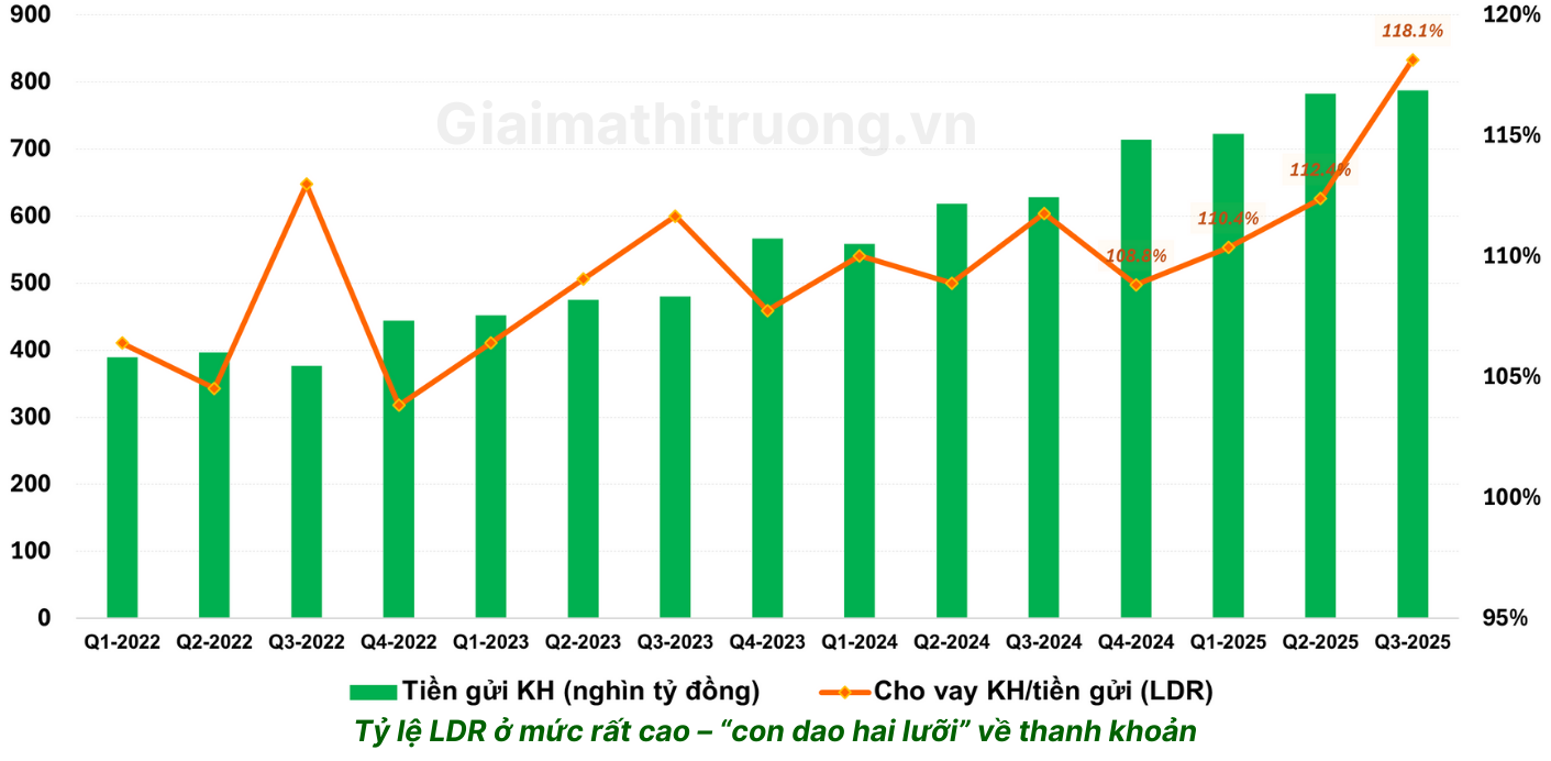 Đến cuối quý 3/2025, tổng huy động tiền gửi tăng 10,4% so với đầu năm, trong khi tín dụng tăng 19,9%. Tỷ lệ cho vay/tiền gửi (LDR) đã tăng liên tục 3 quý và hiện vượt 118% – mức cao nhất trong nhiều năm.