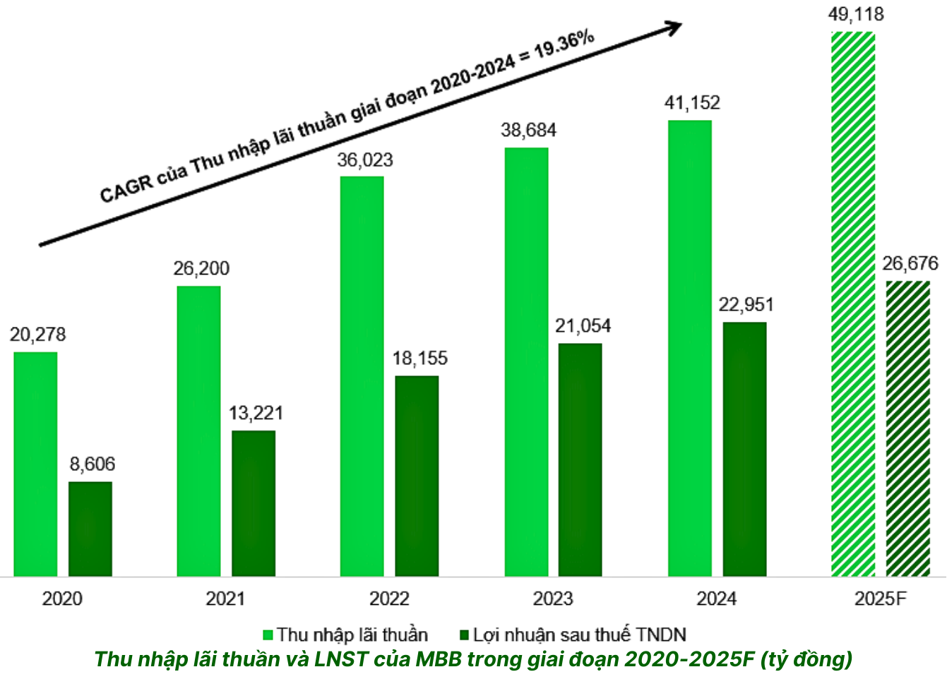 Thu nhập lãi thuần (NII) của MBB giai đoạn 2020–2024 có CAGR khoảng 19,36%/năm. Đây là mức tăng trưởng khá ấn tượng đối với một ngân hàng quy mô lớn như MBB.