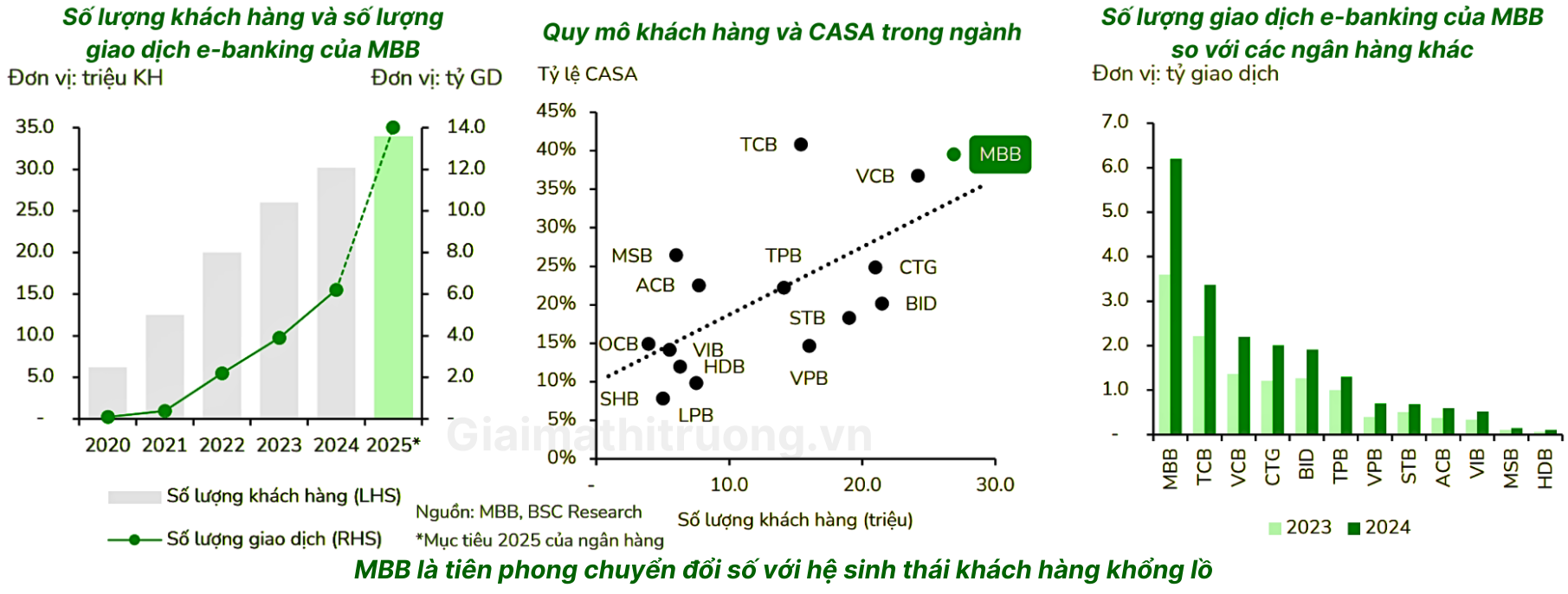 Với tệp khách hàng lớn nhất ngành, MBB ghi nhận tổng số lượng giao dịch e-banking còn ấn tượng hơn với khoảng 9,6 tỷ giao dịch trong 9 tháng đầu năm. Dự kiến đến hết 2025 MBB sẽ ghi nhận 14 tỷ giao dịch, 1 con số kỷ lục của riêng MBB và cả ngành ngân hàng.