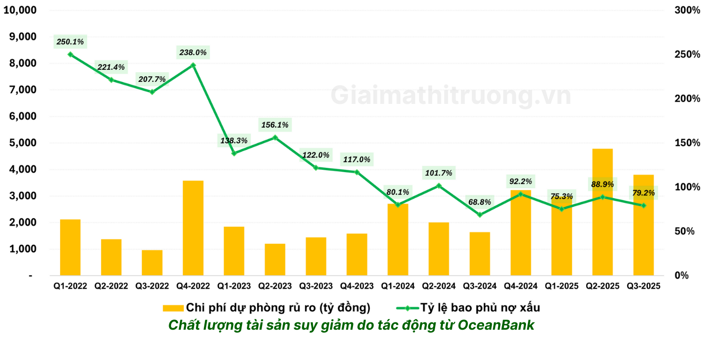 Tỷ lệ nợ xấu quý 3/2025 tăng từ 1,60% lên 1,87%, trong khi tỷ lệ bao phủ nợ xấu giảm từ 88,9% xuống 79,2% – thấp hơn đáng kể so với giai đoạn 2023 trở về trước và dưới mức trung bình ngành (khoảng 84%). Nói cách khác, “vùng đệm an toàn” của MBB tại thời điểm này không còn dày như trước.