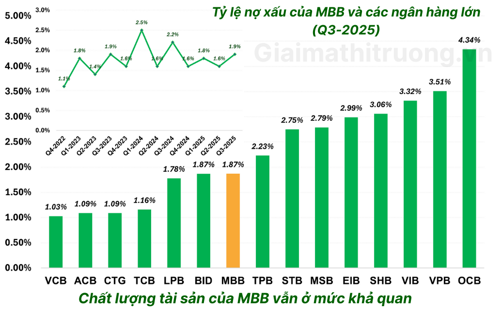 MBB thường xuyên nằm trong top 5 về NIM và duy trì nợ xấu dưới 2%. Dù vậy, xu hướng thu hẹp NIM trong ngắn hạn là điều gần như tất yếu với toàn ngành khi các ngân hàng chấp nhận giảm biên lợi nhuận để mở rộng quy mô bảng cân đối và hỗ trợ nền kinh tế.