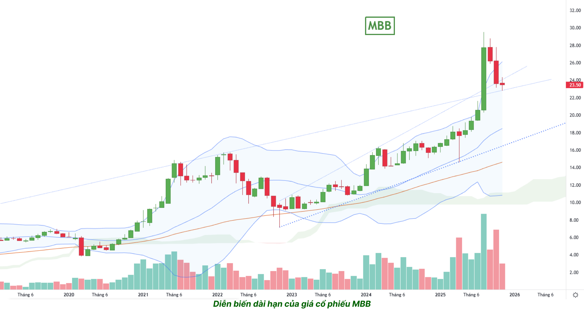 Tại thời điểm đóng cửa phiên 26/11/2025, MBB giao dịch quanh 23.200 đồng/cp, tương ứng P/B khoảng 1,4 lần và P/E trailing khoảng 6,7 lần. ROE dự kiến năm 2025 khoảng 21,5% – nằm trong nhóm cao nhất ngành. Nếu nhìn thuần túy về chất lượng doanh nghiệp, GMTT đánh giá MBB là một trong những cổ phiếu ngân hàng “đẹp” nhất trên thị trường: mô hình kinh doanh rõ, tăng trưởng dài hạn khả quan, thương hiệu mạnh, chuyển đổi số tiên phong.
