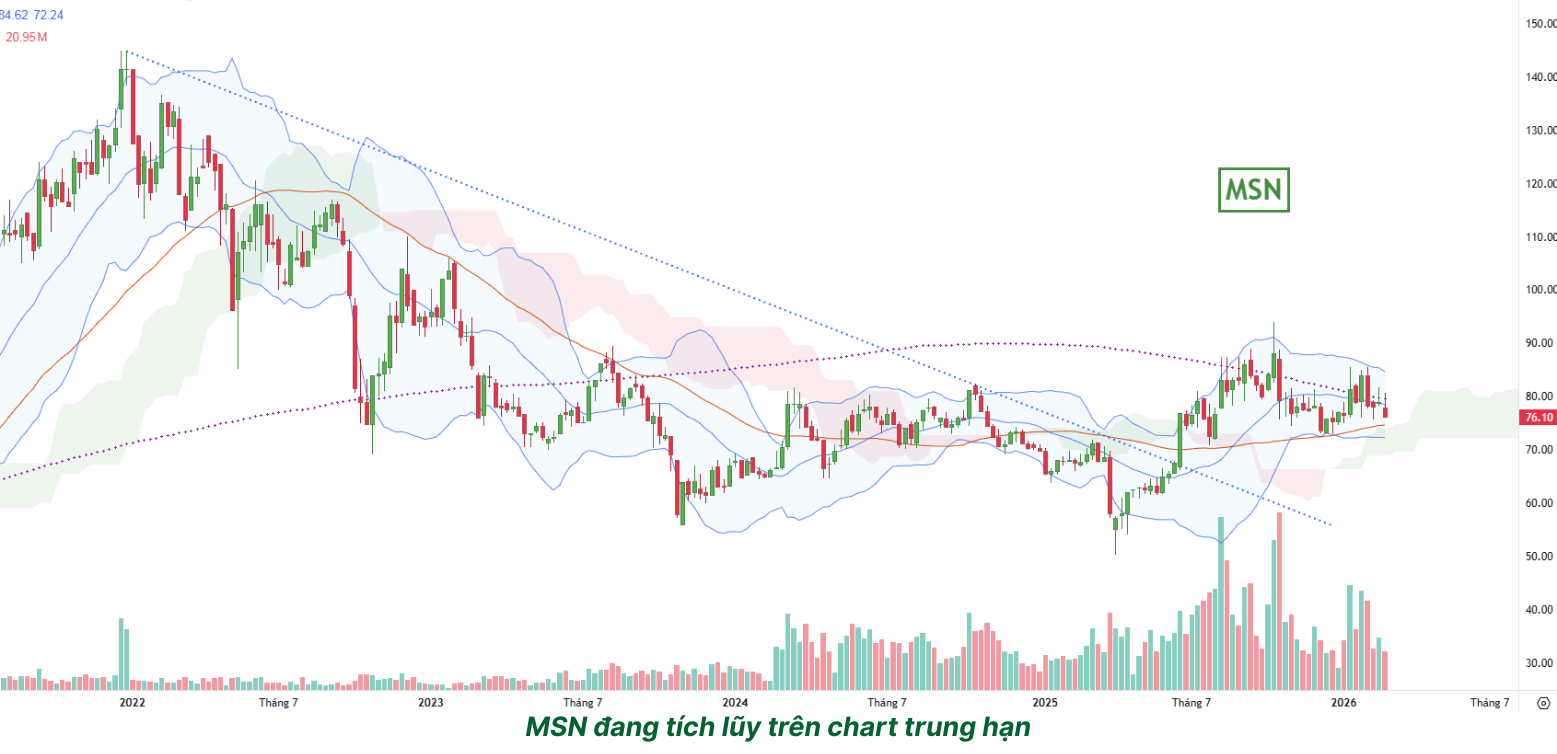 Tính đến đầu 3/2026, MSN đang giao dịch quanh mức 77.000 VNĐ/cổ phiếu. Cổ phiếu đã hồi phục đáng kể từ đáy nhưng vẫn còn cách xa đỉnh lịch sử, tạo ra vùng upside hấp dẫn cho nhà đầu tư trung và dài hạn.
