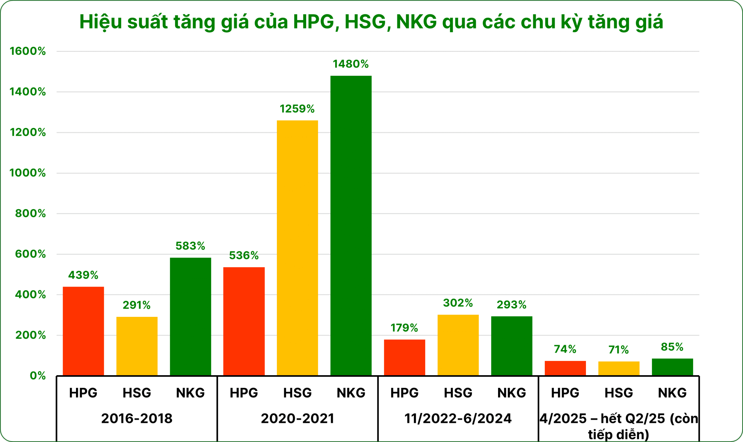 Về quy mô vốn hóa cổ phiếu ngành thép trên sàn thì NKG đứng thứ 3 sau HPG và HSG. Đây cũng là 3 cổ phiếu lớn nhất và quen thuộc được nhà đầu tư réo tên khi có sóng ngành thép. HPG là cổ phiếu đầu ngành với hàm lượng cơ bản cao, chất lượng tài sản tốt, đó là điều chúng ta không có gì phải bàn cãi. Nhưng trong các chu kỳ tăng giá, HPG thường lép vế so với NKG và HSG. Thống kê thực tế về hiệu suất tăng giá của 3 mã này ở mỗi chu kỳ thị trường uptrend được thể hiện qua biểu đồ bên dưới.