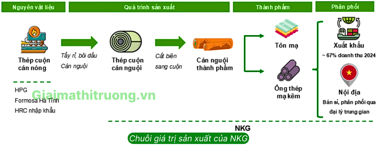 Đầu vào của Nam Kim chủ yếu là thép cuộn cáng nóng (HRC), sau khi trải qua quá trình cán thép và mạ hợp kim, thép cuộn cán nóng ban đầu sẽ được sản xuất thành tôn mạ và ống thép. Hiện nay, NKG phụ thuộc phần lớn nguồn cung HRC từ Trung Quốc và Ấn Độ, phần còn lại chủ yếu được cung ứng từ thị trường nội địa (HPG, Formosa).