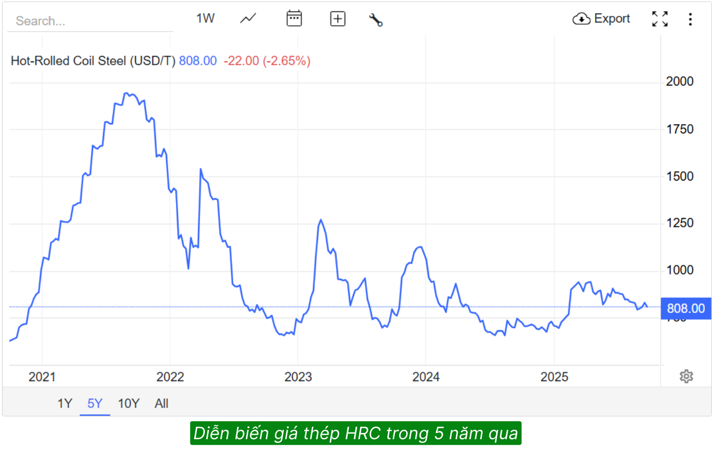 Thép HRC đã điều chỉnh liên tục trong hơn 3 năm và có dấu hiệu tạo đáy tháng 12/2024. Tuy vậy, sang năm 2025 giá HRC vẫn chưa hồi phục nhiều và vẫn ở vùng đáy dài hạn. GMTT kỳ vọng giá thép HRC đã tạo đáy vào tháng 12/2024 và sẽ hồi phục mạnh trong nửa cuối 2025 đến hết 2026.