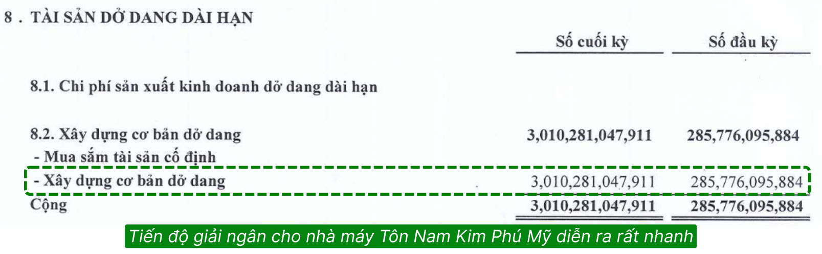 Tính tới hết Q2/2025, giá trị xây dựng cơ bản dở dang của Nhà máy Nam Kim Phú Mỹ đạt 3.010 tỷ VND (tương ứng với 48,5% tổng vốn đầu tư).