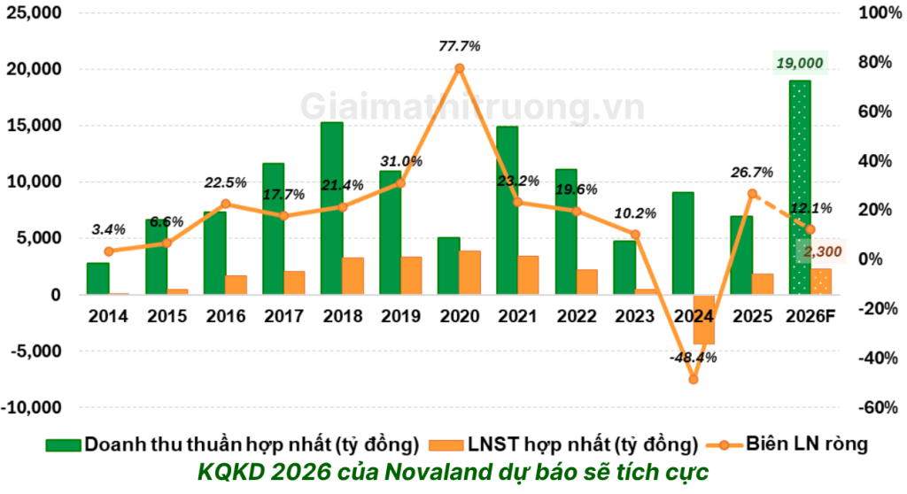 Trong năm 2026, Novaland dự kiến triển khai xây dựng 9.122 sản phẩm và bàn giao 5.241 sản phẩm. Doanh thu từ các dự án được kỳ vọng đạt hơn 45.800 tỷ đồng với lợi nhuận dự án trên 14.300 tỷ đồng, dựa trên giả định tiến độ xây dựng và bàn giao được đẩy nhanh.