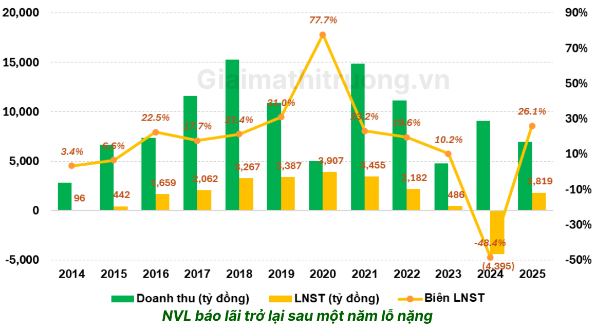 Cả năm 2025, NVL đạt lợi nhuận sau thuế 1.819 tỷ đồng, đảo chiều so với khoản lỗ gần 4.400 tỷ đồng năm trước.