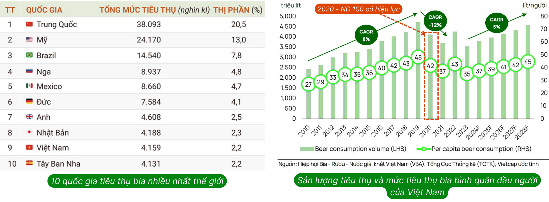Ngành bia Việt Nam đang trong giai đoạn phục hồi chậm sau các cú sốc từ Nghị định 100/2019 (xử phạt nồng độ cồn) và đại dịch, với sản lượng tiêu thụ ước khoảng 4-5 tỷ lít/năm. Theo số liệu năm 2021, Việt Nam là thị trường bia lớn thứ 3 châu Á (sau Trung Quốc và Nhật Bản). Ngành bia vẫn được dự báo tăng trưởng kép với tốc độ 8.6%/năm trong giai đoạn 2024-2028 và đạt mốc 6,4 tỷ lít vào năm 2028, theo Euromonitor. Điều này nhờ vào sự phục hồi kinh tế và người dân thích nghi dần với quy định phạt nồng độ cồn.