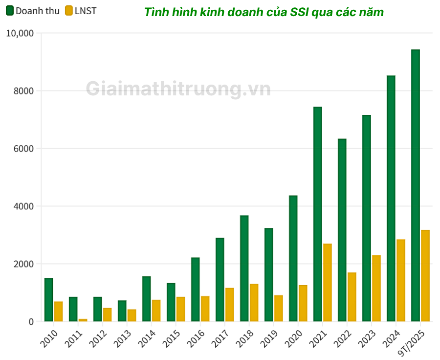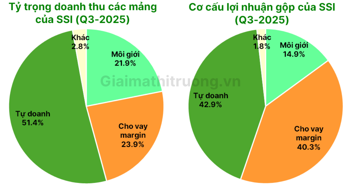 Điều này giúp SSI có lợi nhuận ổn định và bền vững hơn các đối thủ trong ngành vốn phụ thuộc vào 1–2 mảng là tự doanh hoặc cho vay margin.