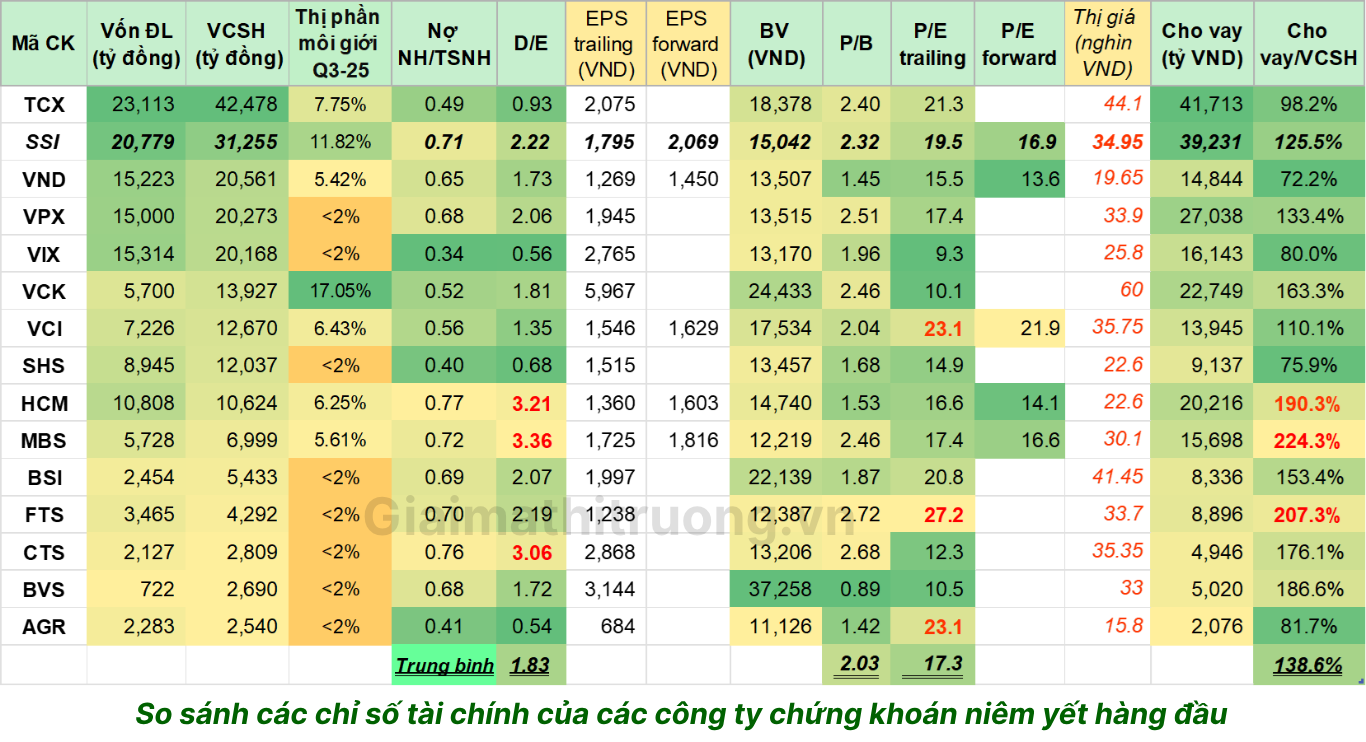 Về cơ cấu tài chính, nợ phải trả của SSI tính đến cuối quý III/2025 đạt 69.456 tỷ đồng, tăng gần 49% so với đầu năm, chủ yếu đến từ các khoản vay ngắn hạn nhằm tài trợ cho hoạt động cho vay ký quỹ và đầu tư. Tỷ lệ D/E (Nợ/VCSH) của SSI tới hết quý 3-2025 đạt 2.2 lần, cao hơn trung bình ngành (khoảng 1,8 lần). Đây là rủi ro đáng kể nhất của SSI.