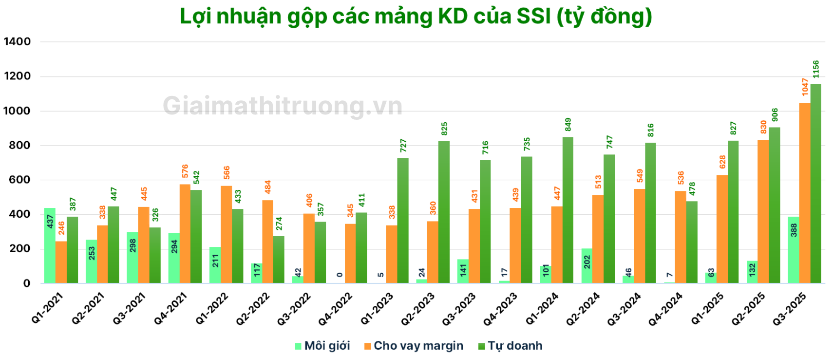 Q3/2025, SSI tiếp tục ghi nhận kết quả rất tích cực ở cả 3 mảng hoạt động: cho vay margin, tự doanh và môi giới. Cụ thể, doanh thu hoạt động và LNST đạt lần lượt 4.212 tỷ (+104% svck) và 1.476 tỷ (+86% svck).