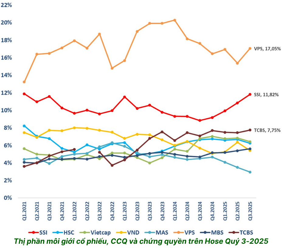 Trong Qúy 3-2025, thị phần môi giới cổ phiếu, chứng chỉ quỹ và chứng quyền có bảo đảm của SSI trên HOSE đạt 11,82%, tăng gần 1 điểm %, tiếp tục duy trì vị trí top 2 toàn thị trường và bỏ xa vị trí thứ 3 của TCX tới hơn 4 điểm %. Thị phần môi giới của SSI đạt mức cao nhất 5 năm, rút ngắn đáng kể khoảng cách với top đầu VPS.