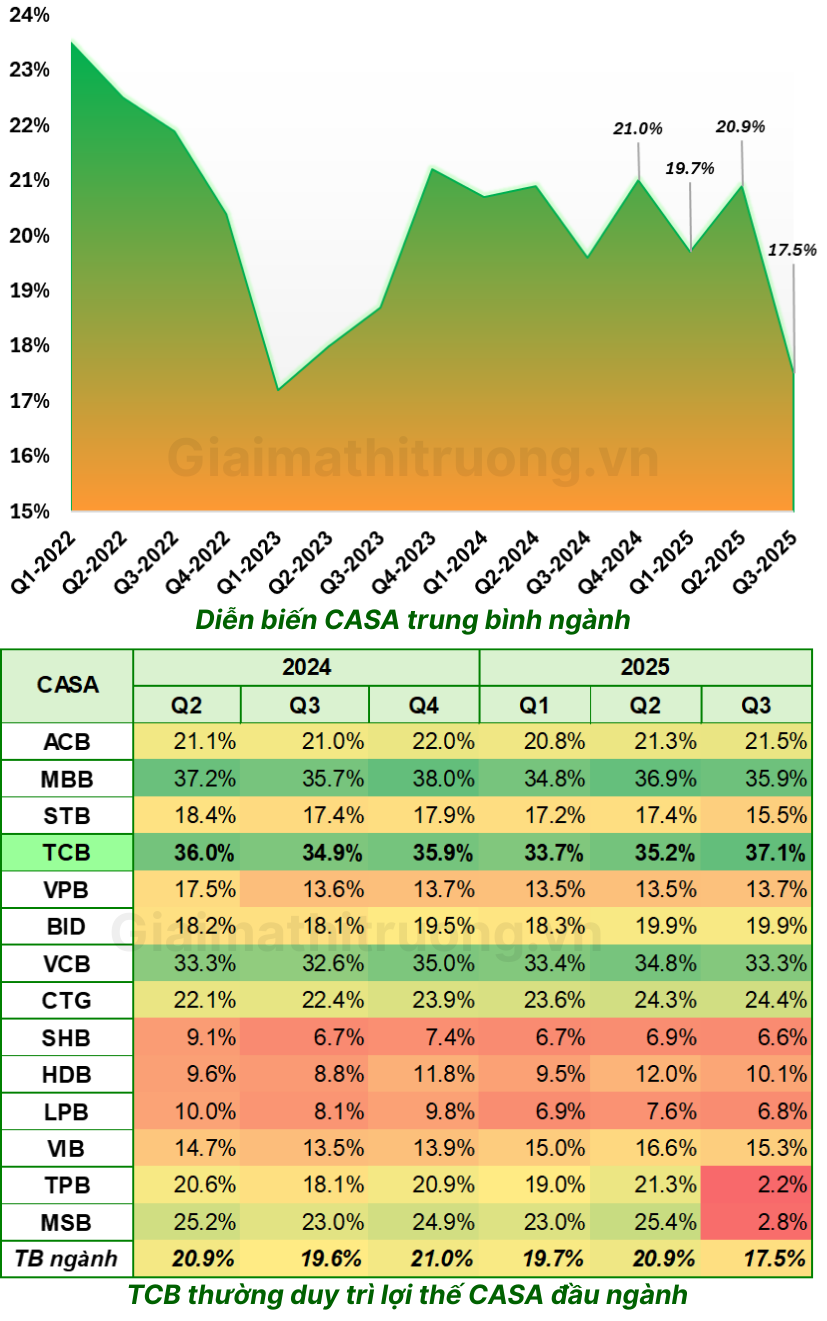 Đến 9T/2025, tỷ lệ CASA của TCB đạt 37,1%, tăng tốt so với cùng kỳ và tiếp tục giữ vị trí số 1 ngành. Khoảng cách giữa TCB với mức trung bình ngành vẫn rất rộng.