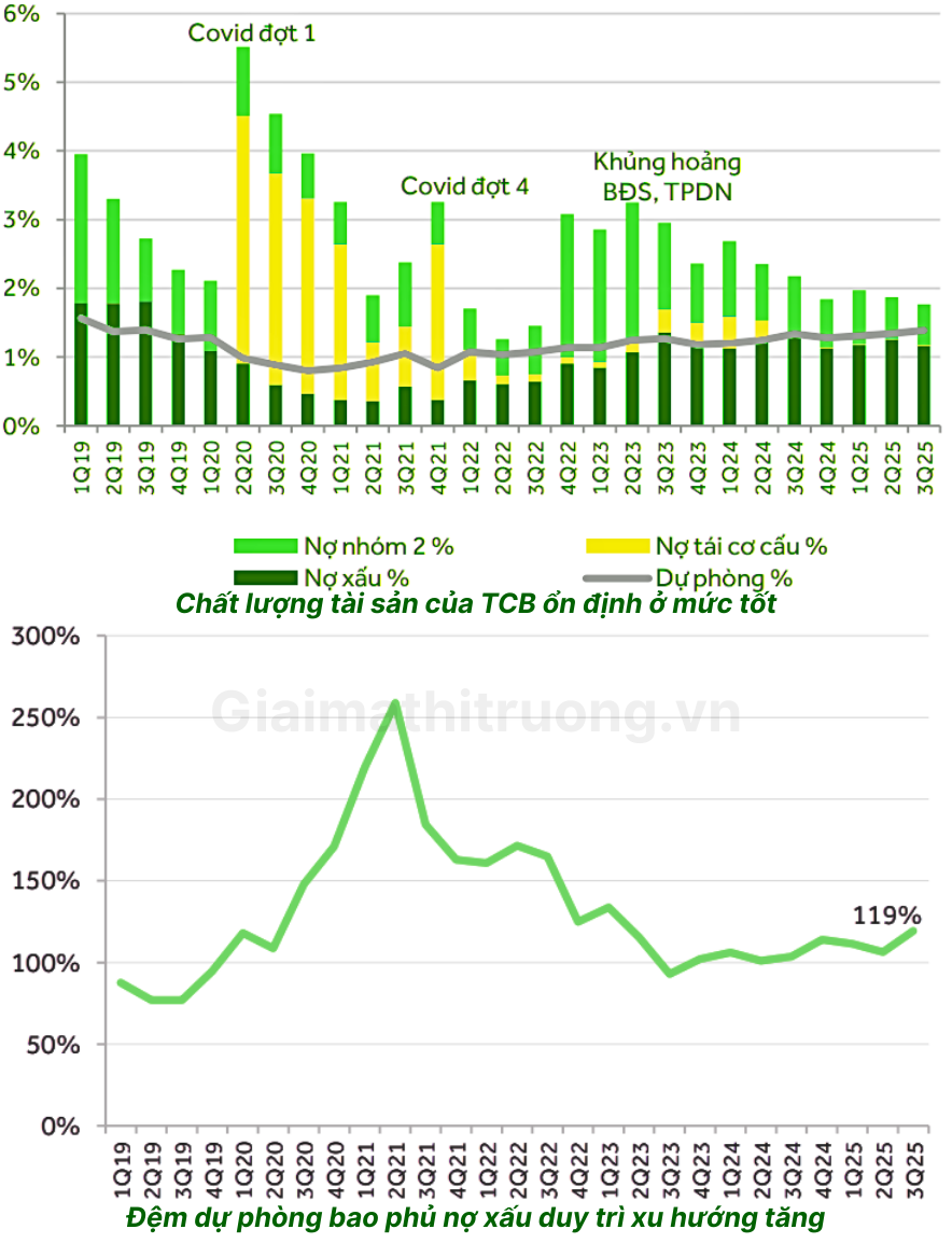 • Tỷ lệ bao phủ nợ xấu (LLR) tăng lên khoảng 119% cuối quý 3/2025. Dù chưa hồi phục đệm dự phòng dày như giai đoạn Covid, nhưng vẫn thuộc nhóm top đầu ngành và vượt xa mức trung bình khoảng 84% của hệ thống. Điều này cho TCB một “vùng đệm” để nếu chu kỳ xấu đi, ngân hàng vẫn còn dư địa tăng trích lập mà không làm lệch hướng quỹ đạo lợi nhuận.