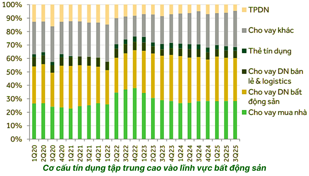 Đến hết Q3-2025, tổng tín dụng với bất động sản (bao gồm cả trái phiếu) chiếm khoảng 59% tổng dư nợ của TCB – một con số rất lớn.