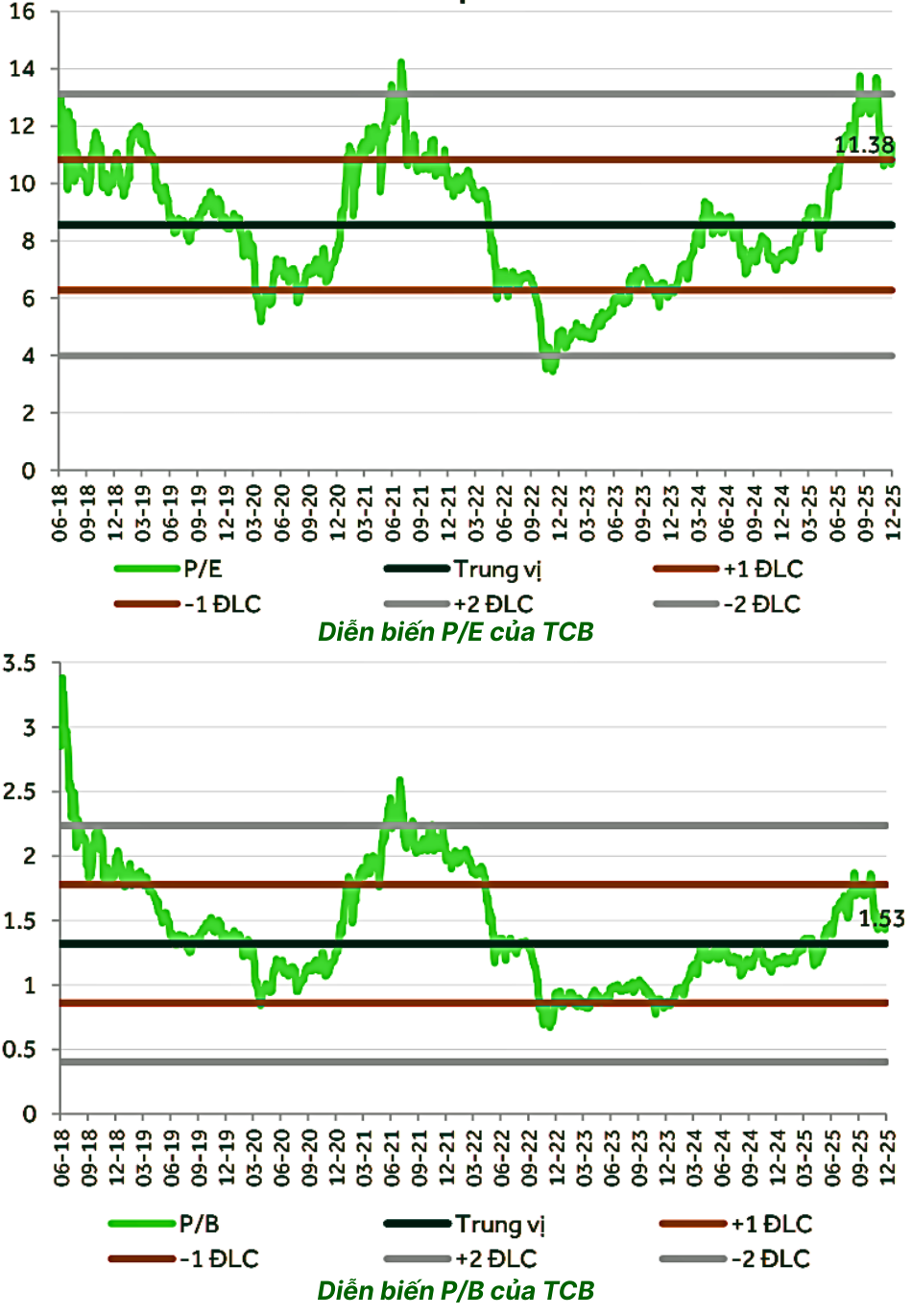 • Cao hơn trung bình ngành (nhiều ngân hàng vẫn giao dịch với P/E dưới 8 lần, P/B dưới 1,2 lần)